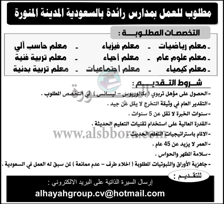 تعلن مدراس رائدة بالمملكة العربية السعودية عن حاجتها الى معلمين مصريين فى جميع التخصصات، وعلى الراغبين فى التقديم ارسال السيرة الذاتية عبر الايميل المنشور فى اعلان جريدة الاهرام يوم الجمعة الموافق 15 مارس 2019.