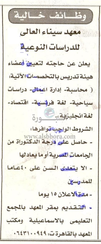 يعلن معهد سيناء العالى للدراسات النوعية عن حاجته الى اعضاء هيئة التدريس، وعلى الراغبين فى الحصول على الوظيفة تقديم الطلبات بمقر المعهد بالمجمع التعليمى بالاسماعيلية ومكتب المعهد بالقاهرة، على ارقام التليفون المنشور فى اعلان جريدة اخبار اليوم السبت الموافق 16 مارس 2019، ولمدة 15 يوما من تاريخ نشر الاعلان.