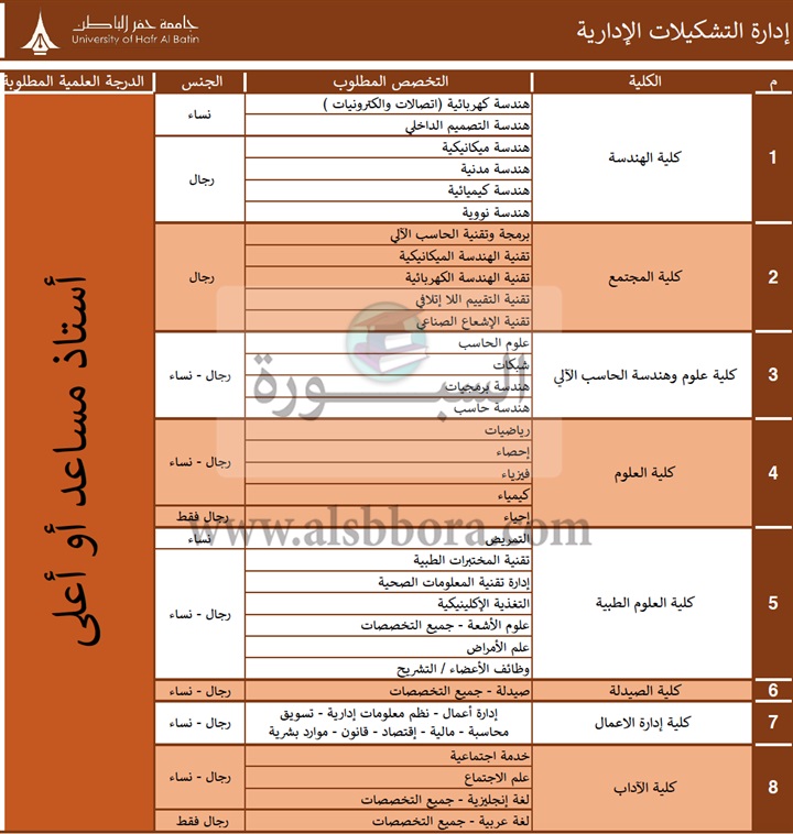 تعلن جامعة حفر الباطن عن توفر عدد من الوظائف الأكاديمية الشاغرة على مرتبة ( أستاذ / أستاذ مشارك / أستاذ مساعد ) بعدد من التخصصات للجنسين حيث يبدأ التقديم اعتبارًا من الساعة الثامنة من صباح يوم الأحد ١٠ / ٧ / ١٤٤٠هـ الموافق 17 مارس 2019،وحتى نهاية دوام يوم الخميس ١٤ / ٧ / ١٤٤٠هـ الموافق 21 مارس 2019 عبر موقع الجامعة الالكتروني من خلال الرابط التالي : jobsacad.uhb.edu.sa