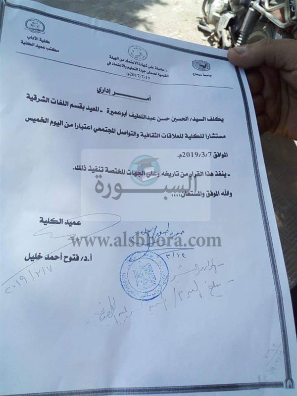 أصدر الدكتور فتوح خليل القائم بأعمال عميد كلية الآداب بجامعة سوهاج قرارا بتكليف الحسين أبوعميرة المعيد بقسم اللغات الشرقية بالكلية والذي يعمل مطربا وممثلا بالكليبات الشعبية الهابطة مستشارا ثقافيا للكلية