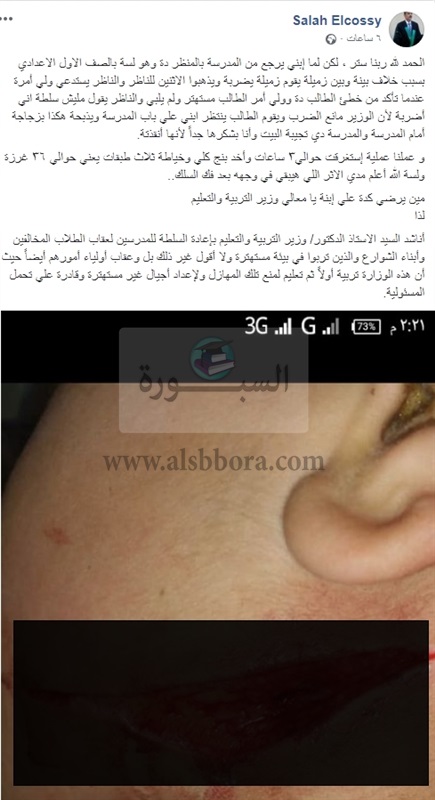وجه أحد أولياء الأمور رسالة لوزير التربية والتعليم، الدكتور طارق شوقي يطالبه باعادة السلطة للمعلمين بإنزال العقاب الطلاب المخالفين وذلك بعد تعرض ابنه لعلقة موت على يد طالب اخر وقد جاء نص الرسالة كالاتي: