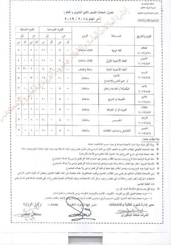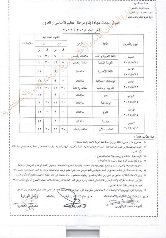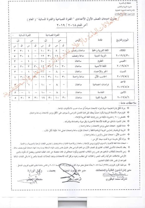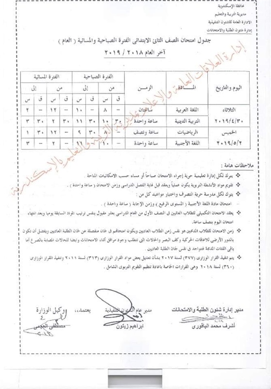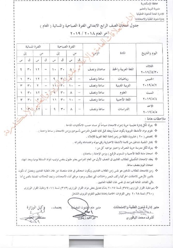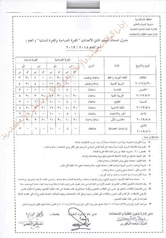 اعلنت مديرية التربية والتعليم بمحافظة الاسكندرية، عن جداول امتحانات آخر العام للعام الدراسى 2019/2018، بداية من الصفوف الثانى الابتدائى الى الصف الثانى الثانوى، والتى جاءت كالتالى: