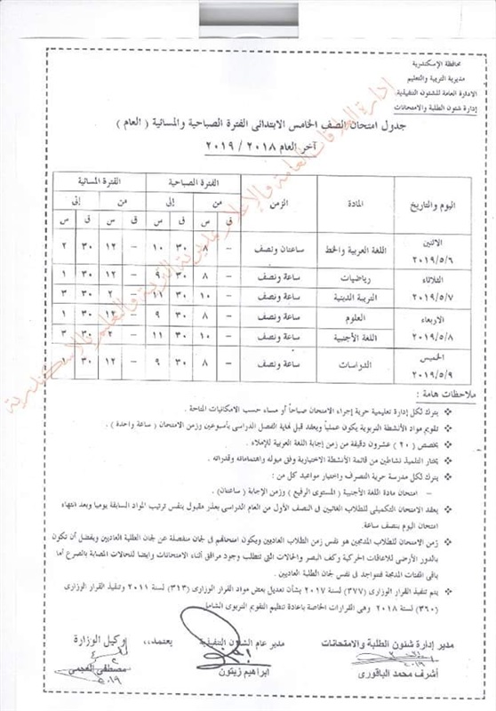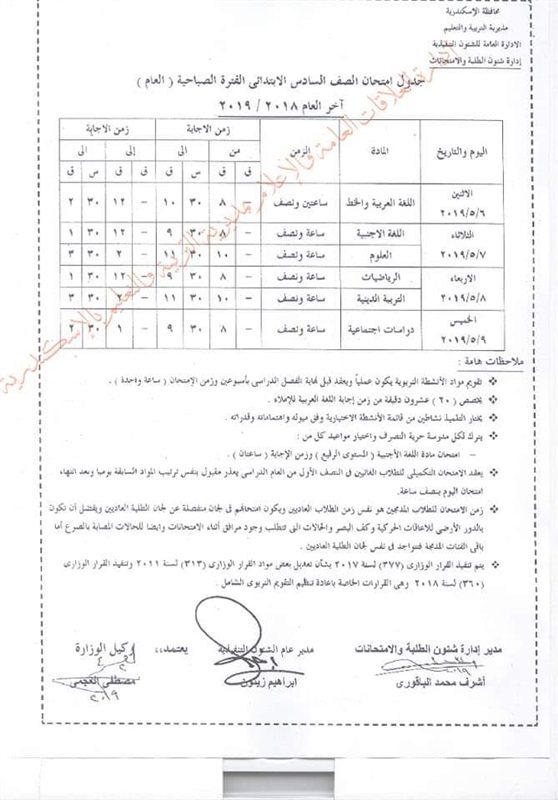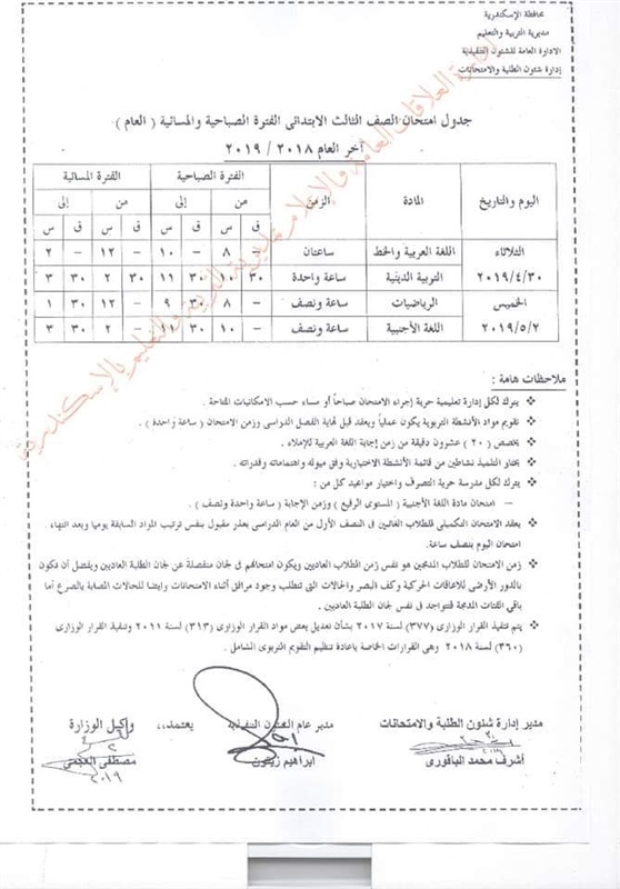 تعليم الاسكندرية تعلن امتحانات آخر العام لصفوف النقل من الثانى الابتدائى الى الثانى الثانوى