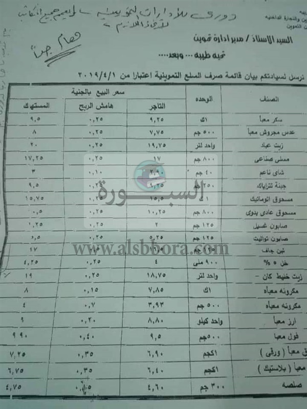 تداول نشطاء "فيسبوك: قائمة اسعار صرف السلع التموينية اعتبارا من 2019/4/1 به صنف كل سلعة وثمن كل سلعة وهامش ربح التاجر، كما حددتها وزارة التموين والتجارة الداخلية حيث جاءت القائمة كالتالى: