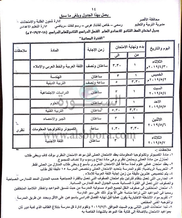 5- المدارس التى تعمل لنظام فترتين يتم امتحان الصفوف التى تعمل بالفترة الصباحية حسب الجدول المعد للمدارس الصباحية والصفوف التى تعمل فى الفترة المسائية حسب الجدول المعد للمدارس المسائية.