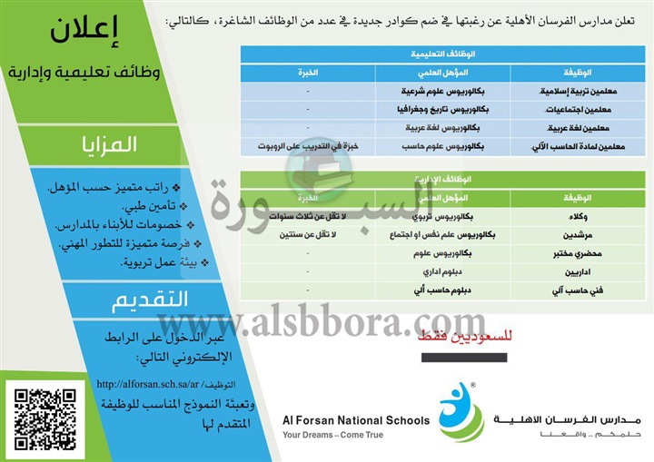 تعلن مدارس الفرسان السعودية عن وظائف جديدة للمعلمين والمعلمات وذلك وفقا لما جاء في نص الإعلان التالي: