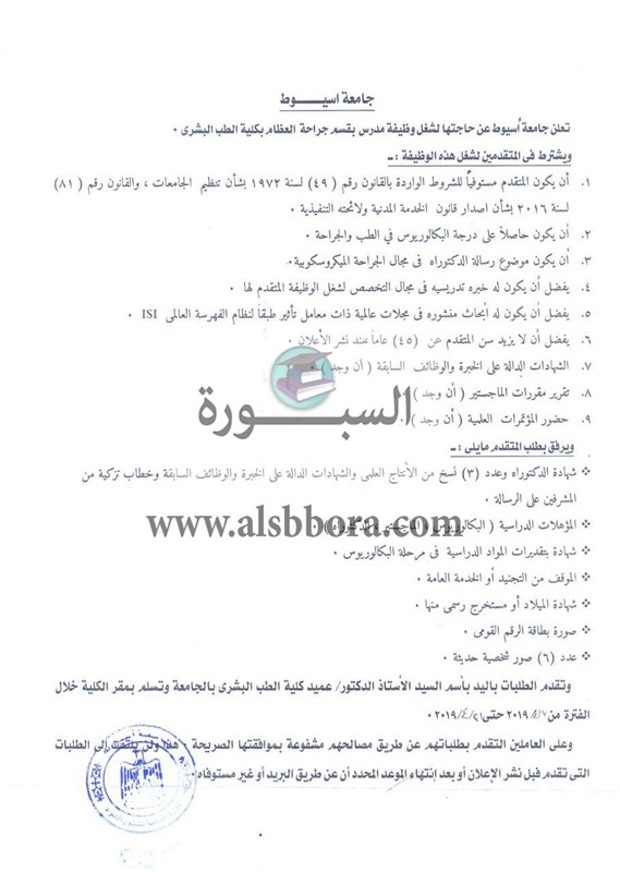 تعلن جامعة أسيوط عن وظائف جديدة لأعضاء هيئة التدريس "من حملة الماجستير والدكتوراه" وذلك وفقا لنص الإعلان التالي:-