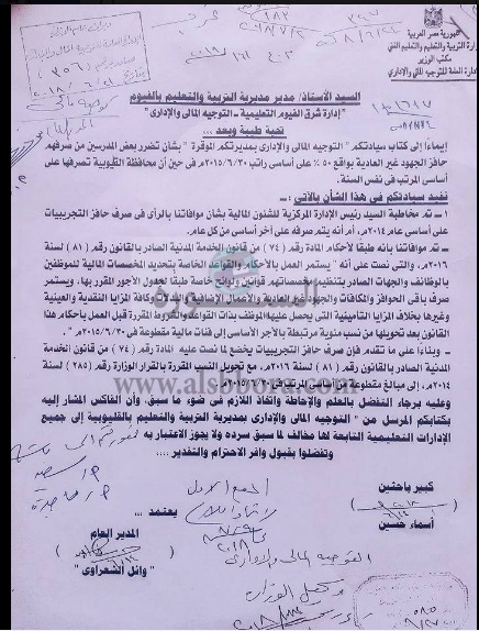 التعليم ترسل فاكسا مهما بشأن صرف حافز التجريبيات للمعلمين على اساسى 2015/6/30.. مستند