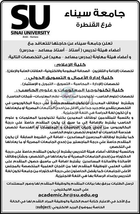 عاجل| جامعة سيناء تعلن عن وظائف جديدة لاعضاء هيئة التدريس "من المعيد الى الاستاذ".. ننشر نص الإعلان