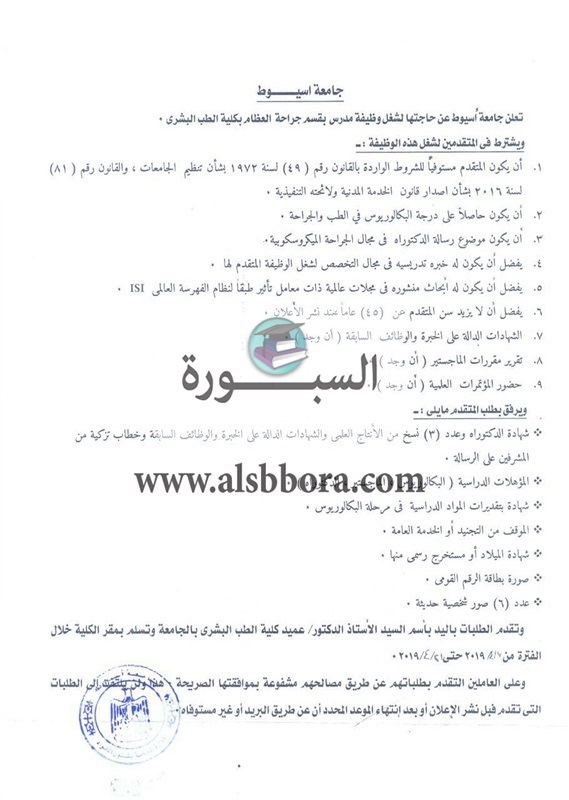 تعلن جامعة أسيوط عن وظائف جديدة لأعضاء هيئة التدريس "من حملة الماجستير والدكتوراه" علما بأن غدا أخر موعد للتقديم وذلك وفقا لنص الإعلان التالي:-