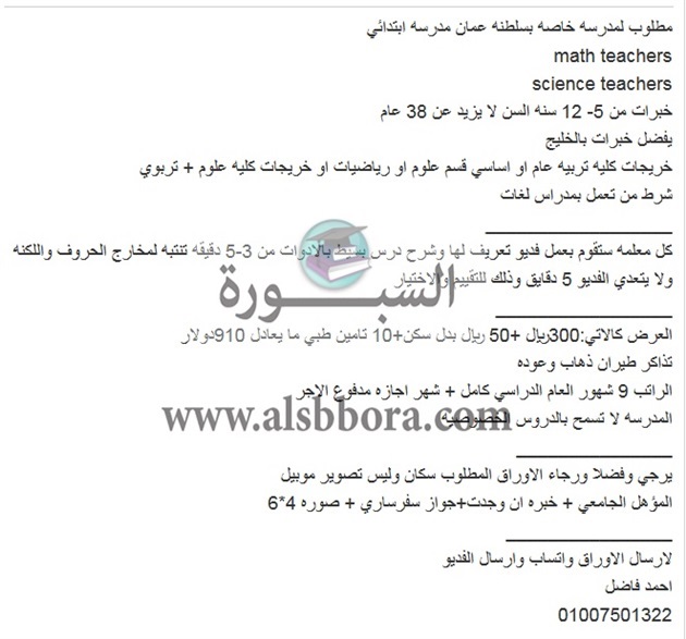 تعلن مدرسة خاصة في سلطنة عمان عن وظائف جديدة للمعلمين والمعلمات وذلك وفقا لنص الإعلان التالي:-