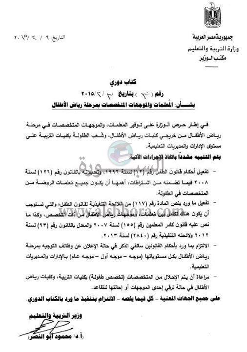 أن تكون معلمة رياض الأطفال حاصلة علي مؤهل عال في دراسات الطفولة من أحدي الكليات التربوية ، وفي حالة عدم توافر هذا المؤهل يجوز تعيين الحاصلات علي مؤهل عال تربوي ، بشرط الحصول علي دبلوم في دراسات الطفولة لا يقل عن عام دراسي . " كما نص الكتاب الدوري رقم 3 لسنة 2015م على ذلك أيضا.