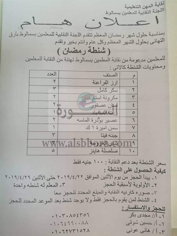 اعلنن نقابة المهن التعليمية فرع سمالوط عن تقديم اللجنة النقابية شنطة رمضان المدعمة من النقابة على ان يكون سعر الشنطة بعد الدعم 100 جنيه.