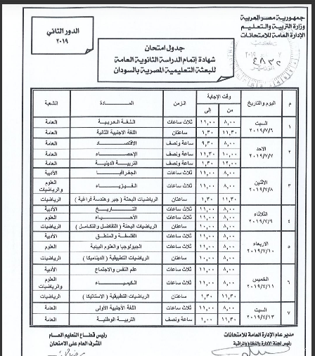 اعتمد الدكتور طارق شوقي، وزير التربية والتعليم والتعليم الفني، جدول امتحانات الدور الثاني لشهادة إتمام الدراسة بالثانوية العامة للبعثة التعليمية المصرية بالسودان، متمنياً النجاح والتوفيق لجميع الطلاب المتقدمين لأداء الامتحان هذا العام.