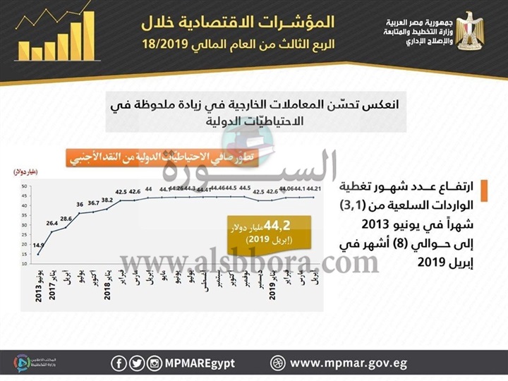 كما أشارت السعيد إلي ارتفاع تدفقات النقد الأجنبي من المصادر الرئيسية لتبلغ نحو 38.8 مليار دولار في النصف الأول من 2018/2019 مقارنة بنحو 36.2 مليار دولار في النصف المناظر من العام الماضي، بنسبة نمو 7.1٪ فضلاً عن تطوّر صافي الاحتياطيّات الدولية من النقد الأجنبي لتبلغ 44.2 مليار دولار في ابريل 2019 لافته إلي ارتفاع عدد شهور تغطية الواردات السلعية من 3,1 شهراً في يونيو 2013 إلى حوالي 8 أشهر في إبريل 2019.