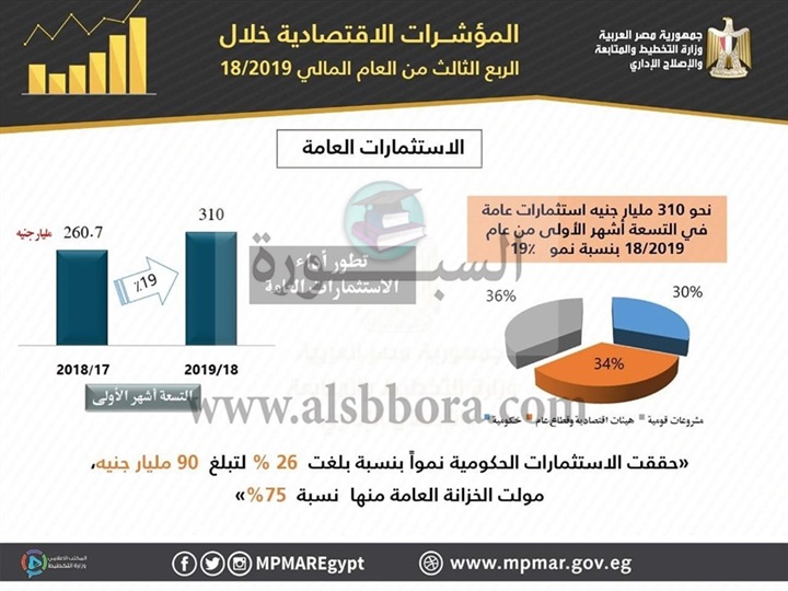 أعلنت د/هالة السعيد وزيرة التخطيط والمتابعة والإصلاح الإداري المؤشرات الاقتصادية عن الربع الثالث من العام المالي الحالي 2018/2019 حيث أشارت د/هالة السعيد عن وجود تطورات ملحوظة في عدد من المؤشرات الاقتصادية مؤكدة أن تلك التطورات تعكس المسار الصحيح الذي يسير فيه الإصلاح الاقتصادي فضلاً عن الخطط التي تضعها الحكومة لتحقيق تنمية شاملة ومستدامة مما يسهم في تحسين مستوي المعيشة للمواطنين من جهة وبما يسهم في تحسين المؤشرات الاقتصادية