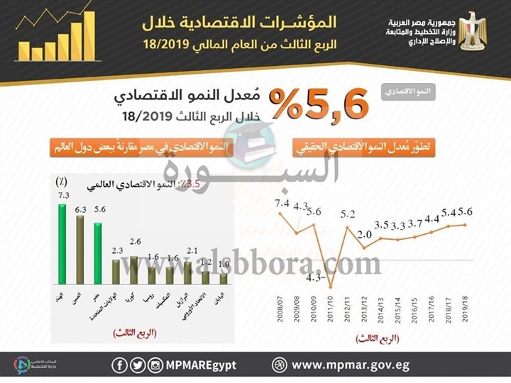 وأعلنت د/هالة السعيد ارتفاع معدل النمو الاقتصادي خلال الربع الثالث من العام المالي الحالي 2018/2019 ليسجل 5.6% مقارنة بـ 5.4% عن الربع المناظر في العام المالي 2017/2018 مشيرة أنه من المستهدف تحقيق معدل نمو يصل إلى 5.8% في الربع الرابع من العام المالي الحالي متابعة أن الاستثمار وصافي الصادرات شكلا معًا حوالي 85% من النمو في النصف الأول من العام المالى الحالي 2018/2019 مقابل 71% في النصف المناظر من العام الماضي