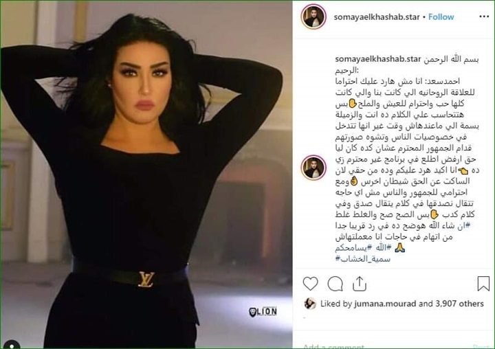وقالت سمية الخشاب: "بسم الله الرحمن الرحيم أحمد سعد : أنا مش هرد عليك احتراما للعلاقة الروحانية اللى كانت بينا، واللى كانت كلها حب واحترام للعيش والملح، بس هتتحاسب على الكلام ده أنت والزميلة بسمة.. أنا أكيد هرد عليكم وده من حقى لأن الساكت عن الحق شيطان أخرس، ومع احترامى للجمهور والناس مش أى حاجة تتقال نصدقها، فيه كلام يتقال صدق، وفيه كلام كدب، بس الصح صح والغلط غلط، إن شاء الله هوضح ده فى رد قريبا جدا من اتهام فى حاجات أنا ماعملتهاش".