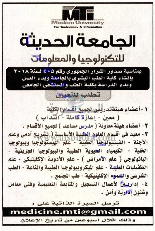 تعلن الجامعة الحديثة عن وظائف جديدة لأعضاء هيئة التدريس "من معيد إلي أستاذ" وذلك وفقا لنص الإعلان التالي:-