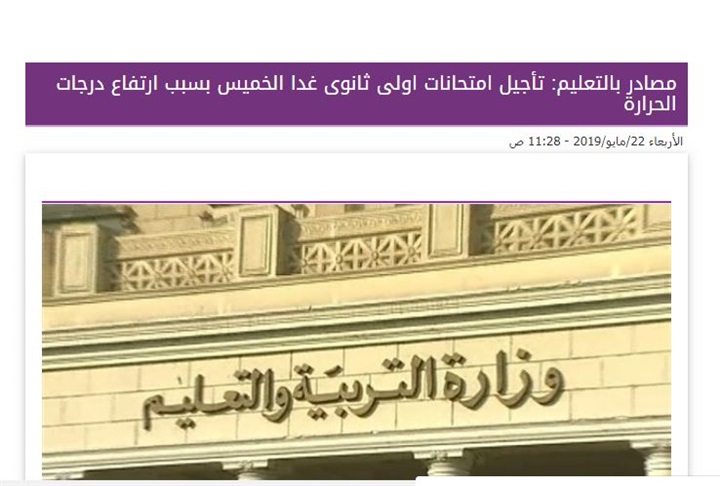 كما انفردت السبورة.. التعليم تقرر رسميا تأجيل امتحانات الصف الأول الثانوي غدًا الخميس بسبب ارتفاع درجات الحرارة