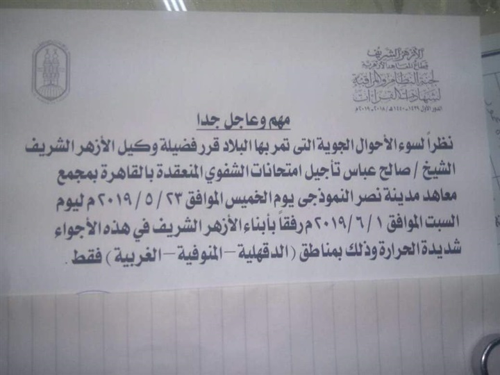 نظرا لسوء الأحوال الجوية وارتفاع درجات الحرارة قرر الشيخ صالح عباس، وكيل الأزهر الشريف، تأجيل امتحانات الشفوى المنعقدة بالقاهرة بمجمع معاهد مدينة نصر النموذجى غدا الخميس 23 مايو ليوم السبت 1 يونيو، رفقا بأبناء الأزهر الشريف فى هذه الظروف من الطقس السئ الذى تتعرض له البلاد، وذلك بمناطق الدقهلية والمنوفية والغربية.