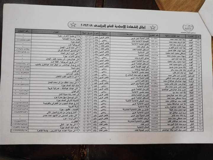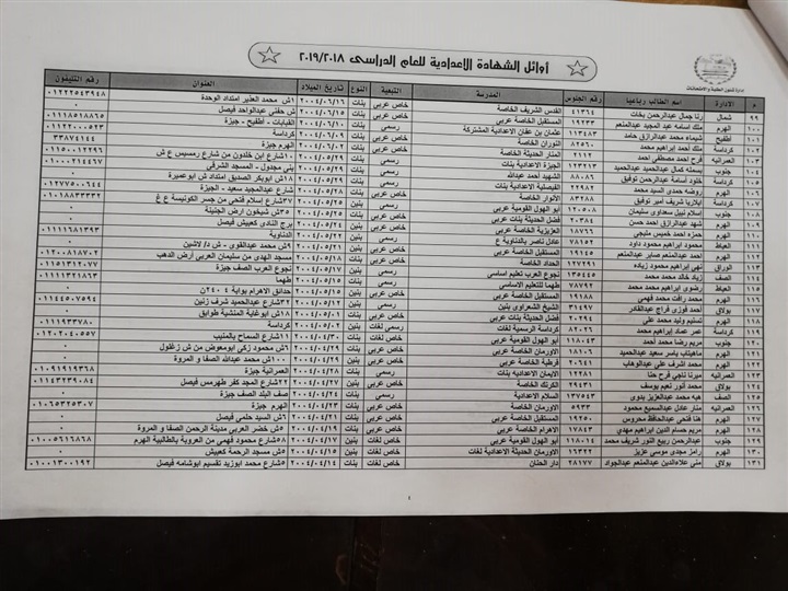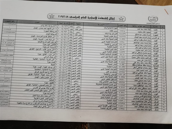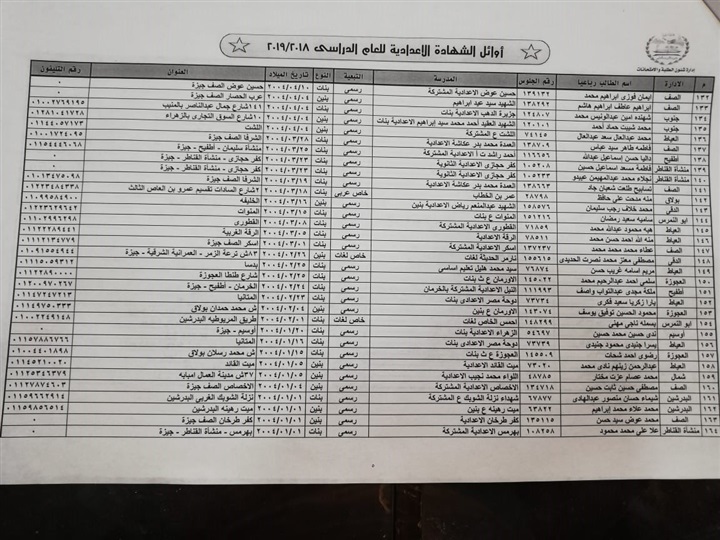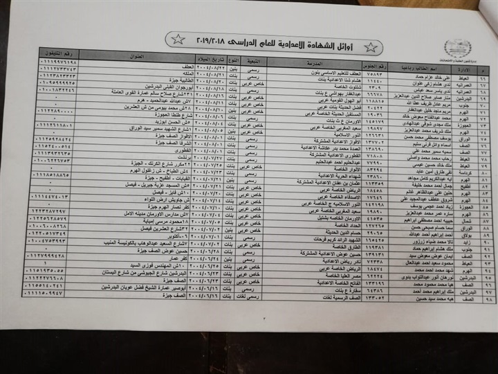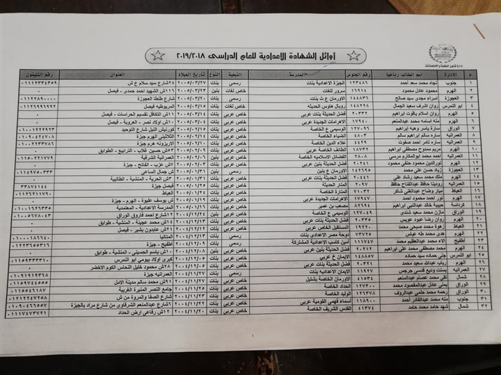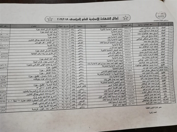 بالاسماء.. اوائل الشهادة الاعدادية بالجيزة