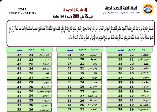 اعلنت هيئة الأرصاد الجوية، أنه من المتوقع ان يحدث تغيرات كبيرة فى الطقس حيث من المتوقع ان تنخفض درجات الحرارة، غدا السبت، ليسود طقس لطيف على السواحل الشمالية، حار على الوجه البحري والقاهرة، شديد الحرارة على أغلب الأنحاء نهارا، لطيف ليلا.