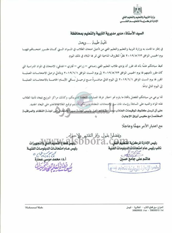 نحيط سيادتكم علما بانه قد تقرر ان يؤدى طلاب التعليم الفنى (صناعى، زراعى، تجارى، فندقى) الامتحان فى المواد الدراسية التى كان مقرر تأديتهم لها يوم الخميس الموافق 23 مايو 2019 الى يوم السبت الموافق اول يونيو وبالتالى ترحيل الامتحانات العملية المقرر لها يوم السبت الموافق اول يونيو الى اليوم التالى مباشرة مع ترحيل باقى الايام الخاصة بالامتحانات العملية الى اليوم التالى تباعا.