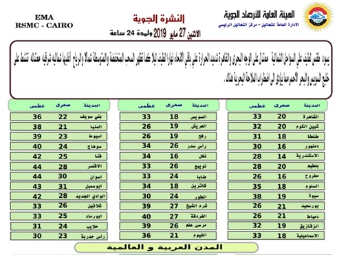 وأشارت الهيئة إلى ظهور السحب المنخفضة والمتوسطة على شمال البلاد، والرياح معتدلة تنشط على خليج السويس والبحر الأحمر مما يؤدي إلى اضطراب الملاحة بهما.