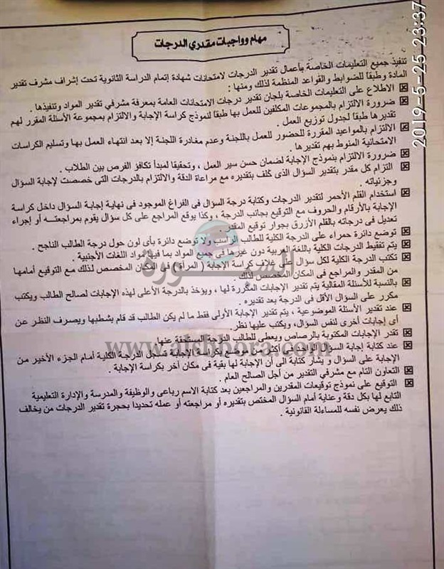 تداول نشطاء التعليم على موقع التواصل الاجتماعى "فيسبوك" مهام وواجبات مقدرى الدرجات للثانوية العامة للعام الدراسى الحالى 2019/2018، والذى من المقرر ان ينطلق ماراثون الثانوية العامة بداية من 8 يونيو الى 3 يوليو المقبل.