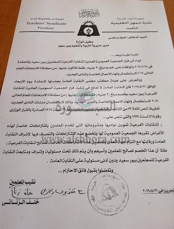 أصدر خلف الزناتي نقيب المعلمين ورئيس اتحاد المعلمين العرب، خطاب موجه للدكتور نبوى باهى وكيل وزارة التعليم بالمحافظة ، إيماء الى قرار الجمعية العادية للنقابة الفرعية للمعلمين والمنعقدة فى 28/3/2019 بالمواقة على خصم مبلغ 30 جنية فقط لا غير من مكافأة الإمتحانات للعام الحالى 2019 لإستكمال وإنهاء الأعمال الخاصة بالنادى الجديد.