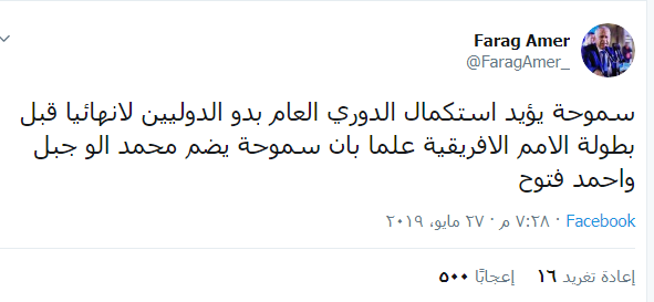وقال عامر عبر صفحته الشخصية على موقع التواصل الإجتماعي "فيس بوك": "سموحة يؤيد استكمال الدوري العام بدون الدوليين قبل بطولة الأمم الإفريقية، علمًا بأن منتخب مصر يضم ثنائي سموحة محمد أبو جبل وأحمد فتوح".