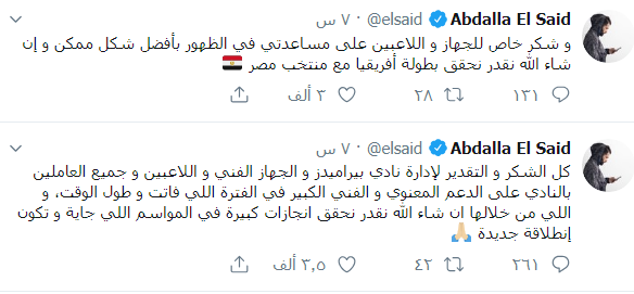 و شكر خاص للجهاز و اللاعبين على مساعدتي في الظهور بأفضل شكل ممكن و إن شاء الله نقدر نحقق بطولة أفريقيا مع منتخب مصر