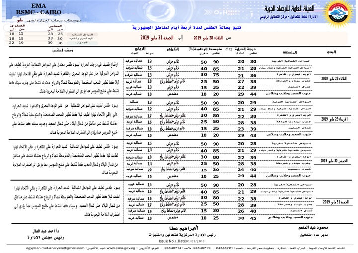 اعلنت هيئة الارصاد الجوية انه من المتوقع استمرار الارتفاع الملحوظ فى درجات الحرارة على كل الأنحاء، الذى بدأ أمس الاثنين، ويستمر حتى غد الجمعة.