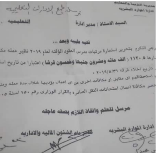 اصدرت وزارة التربية والتعليم تعليمات لجميع الادارات التعليمية باخلاء طرف وانهاء تعاقد المؤقتين بمكافأة ١١٢٠.٥جنيهاً ؛ جاء هذا وفقا لتعليمات وزارة التربية والتعليم لجميع مديريات التربية والتعليم بالمحافظات ؛ حيث صدرت تعليمات رسميه من جميع المديريات التعليمية بالمحافظات للادارات التعليمية التابعه لها بتحرير استمارة مرتبات مدرسين العقود المؤقته نظير عملهم وحتى تاريخ اخلاء طرفهم