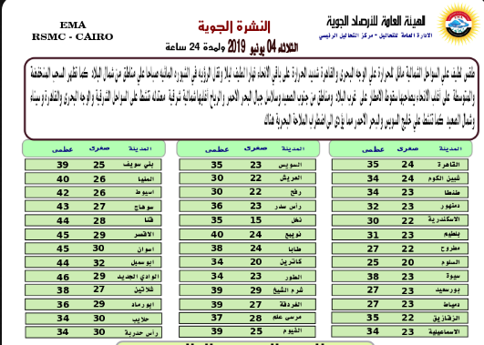 واشار خبراء الأرصاد، انه من المتوقع ان تقل الرؤية فى الشبورة المائية صباحا على مناطق من شمال البلاد، وتظهر السحب المنخفضة والمتوسطة على أغلب الأنحاء، يصاحبها سقوط أمطار على غرب البلاد ومناطق من جنوب الصعيد وسلاسل جبال البحر الأحمر، وتكون الرياح أغلبها شمالية شرقية مُعتدلة تنشط على السواحل الشرقية والوجه البحرى والقاهرة وسيناء وشمال الصعيد، كما تنشط على خليج السويس والبحر الأحمر، ما يؤدى إلى اضطراب الملاحة البحرية هناك.