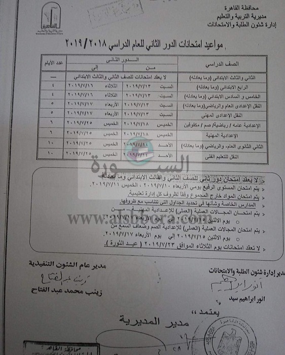 ويستعرض موقع السبورة الجدول المعتمد من مديرية التربية والتعليم بمحافظة القاهرة والذى جاء كالتالى: