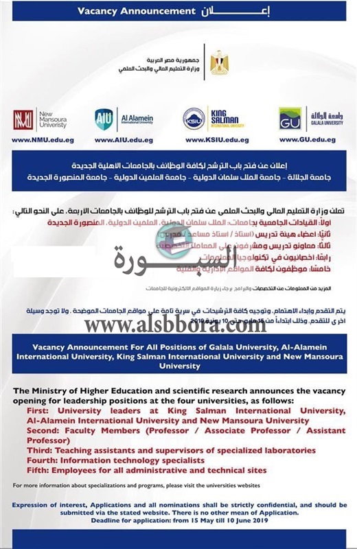 تعلن جامعة المنصورة الجديدة عن عن وظائف جديدة لأعضاء هيئة التدريس " من معيد إلي أستاذ" وذلك وفقا لنص الإعلان التالي :