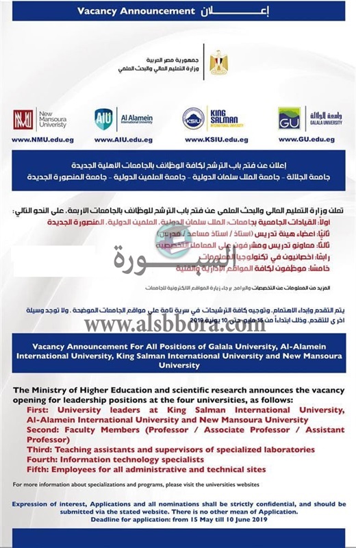 تعلن وزارة التعليم العالي عن وظائف جديدة لأعضاء هيئة التدريس " من معيد إلي أستاذ" وذلك وفقا لنص الإعلان التالي :