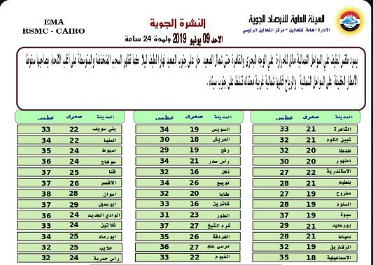 اعلن خبراء هيئة الأرصاد الجوية أنه من المتوقع ان يسود غدًا الأحد، طقس لطيف على السواحل الشمالية، مائل للحرارة على الوجه البحرى والقاهرة حتى شمال الصعيد، حار على جنوب الصعيد نهارا لطيف ليلا.