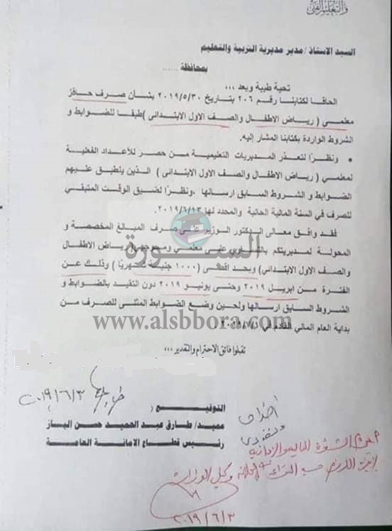 وافق الدكتور،طارق شوقي وزير التربية و التعليم على إلغاء الشروط لصرف حافز تدعيم منظومة التعليم الجديدة لمعلمي و موجهى (رياض الأطفال و الصف الأول الابتدائي ) لهذا العام على أن تطبق الشروط اعتبارا من العام القادم .. بمعنى أن يتم الصرف هذا العام للمستحقين بالمراحل المذكورة دون قيد أو شرط نظرا لضيق الوقت هذا العام و صعوبة الحصر و تنفيذ الشروط مع تطبيق الشروط اعتبارا من العام القادم .... علمًا أن الحد الأقصى الحافز ١٠٠٠ جنيه ( ألف جنيه عن الشهر الواحد) لمدة ٣ شهور ( أبريل .. مايو .. يونيو ٢٠١٩ )