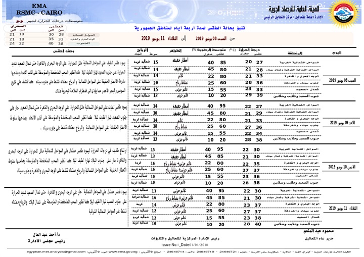 كما يتوقع الخبراء أن تقل الرؤية فى الشبورة المائية صباحا على مناطق من شمال البلاد، كما تظهر السحب المنخفضة والمتوسطة ، والرياح أغلبها شمالية غربية معتدله تنشط على الوجه البحرى والقاهرة وجنوب سيناء.
