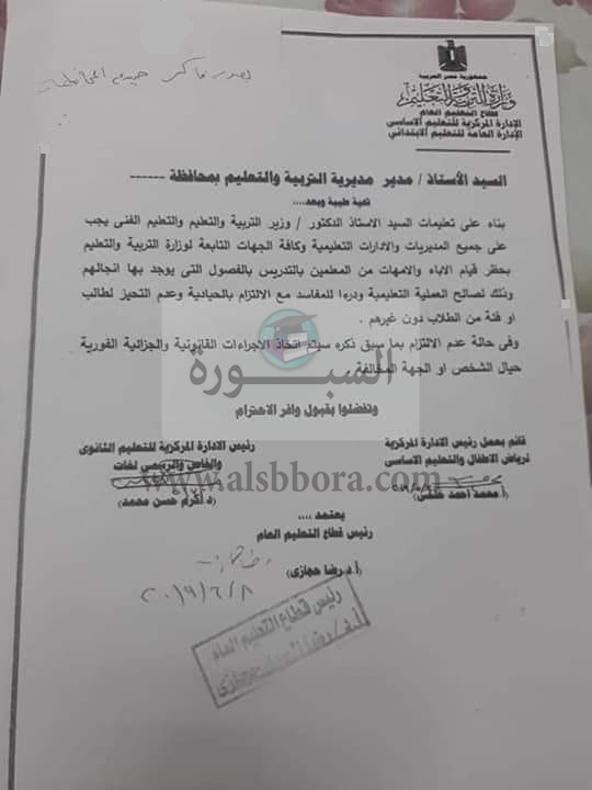 ياتى ذلك فى إطار حرص وزاره التربيه والتعليم والتعليم الفنى على حسن سير العملية التعليمية داخل البيئة المدرسية والمساواة بين جميع ابنائها الطلاب داخل المدارس