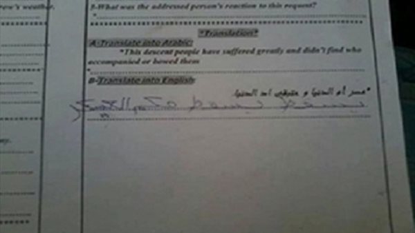 تداول نشطاء علي مواقع التواصل الاجتماعي وصفحات تنتمي لجماعه الاخوان صور لورقه امتحان لغة انجليزية بمدرسه المساعي المشكوره الثانوية بمدينه شبين الكوم محافظه المنوفيه لتلميذ بالصف الثاني الثانوي ،يرد فيها علي سؤال الترجمه بالامتحان " مصر ام الدنيا وحتبقي اد الدنيا" بـ "يسقط يسقط حكم العسكر".