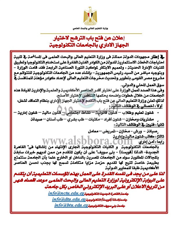 لذلك تعلن وزارة التعليم العالى عن فتح باب الترشح لإختيار قيادات متميزه علمياً وادارياً، وأعضاء هيئة التدريس والهيئة المعاونة، والجهاز الإداري كما يلي: