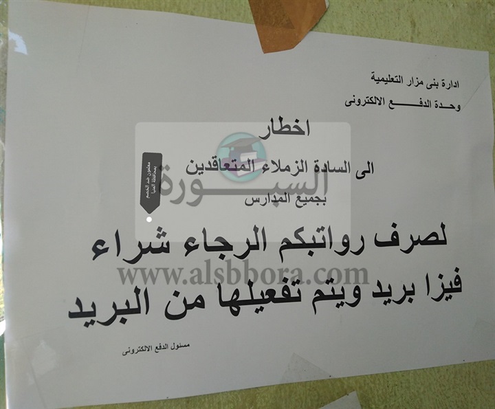 نشر نشطاء التعليم على موقع التواصل الاجتماعى اخطارا من ادارة بنى مزار التابعة الى مديرية التربية والتعليم بمحافظة المنيا بشأن المعلمين المتعاقدين بجميع المدارس من اجل صرف المرتبات الرجاء شراء فيزا بريد ويتم تفعيلها من البريد.