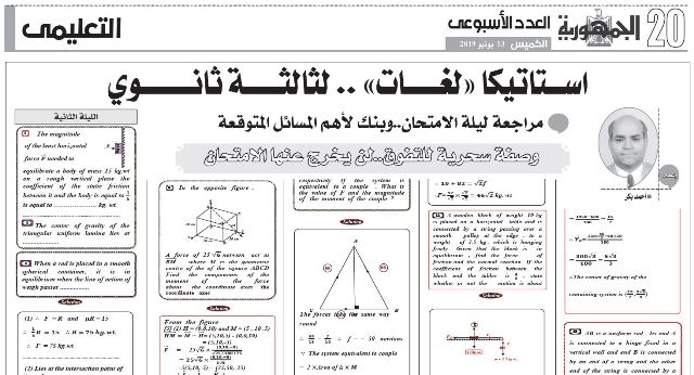 اقوى المراجعات النهائية لمادة الاستاتيكا لغات للثانوية العامة 2019 من ملحق الجمهورية