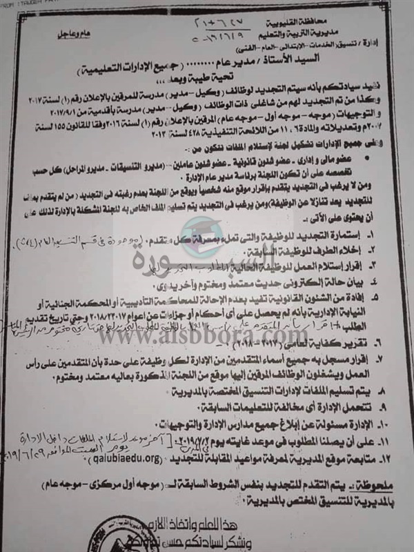 التربية والتعليم بمحافظة القليوبية الصادر بتاريخ 9 / 6 / 2019