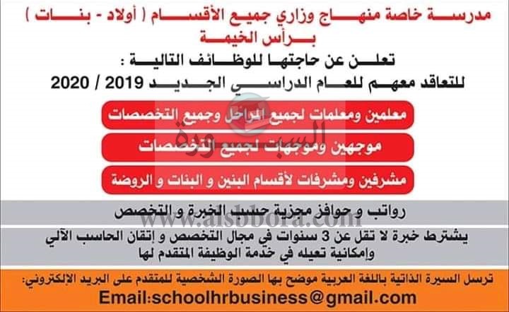 عاجل| مدارس رأس الخيمة الإماراتية تعلن عن وظائف جديدة للمعلمين والمعلمات.. ننشر نص الإعلان
