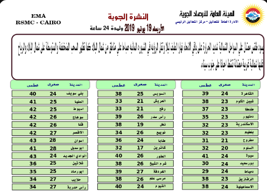 كما تقل الرؤية في الشبورة المائية صباحا علي مناطق من شمال البلاد، وتظهر السحب المنخفضة والمتوسطة على شمال البلاد، والرياح اغلبها شمالية غربية معتدلة تنشط احيانا على جنوب سيناء.